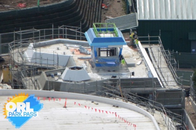 This ride is a rethemed version of Mater’s Junkyard Jamboree, a whip ride at Disney California Adventure. The ride system was built months ago, before the roof started to go up, so we haven’t gotten a look inside for a while. With the structure now enclosed, there’s not much new to see besides exterior elements – it’s possible the Alien ride vehicles are already in place by now.