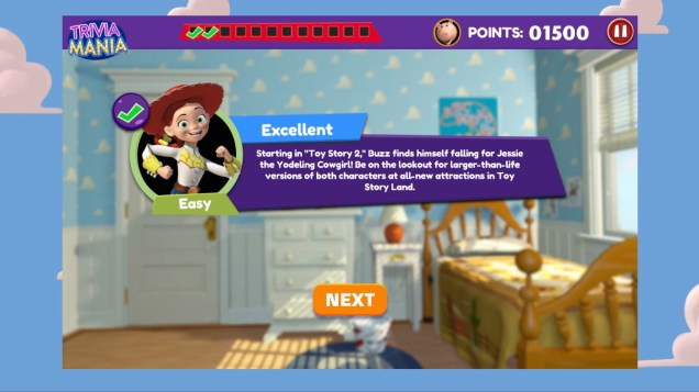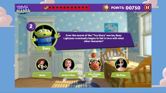 The questions start easy and increase in difficulty as the game goes on. I love that this is considered an “easy” question – Buzz and Jessie are obviously in love, y’all.
