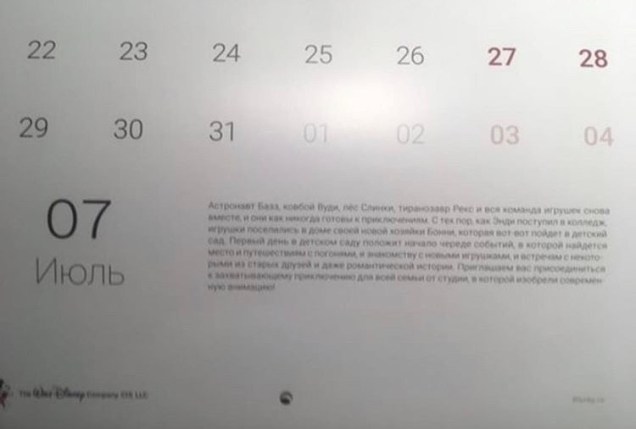 Here’s a photo showing the full calendar image, with the logo in cyrillic and the Disney/Pixar copyright in the lower right: