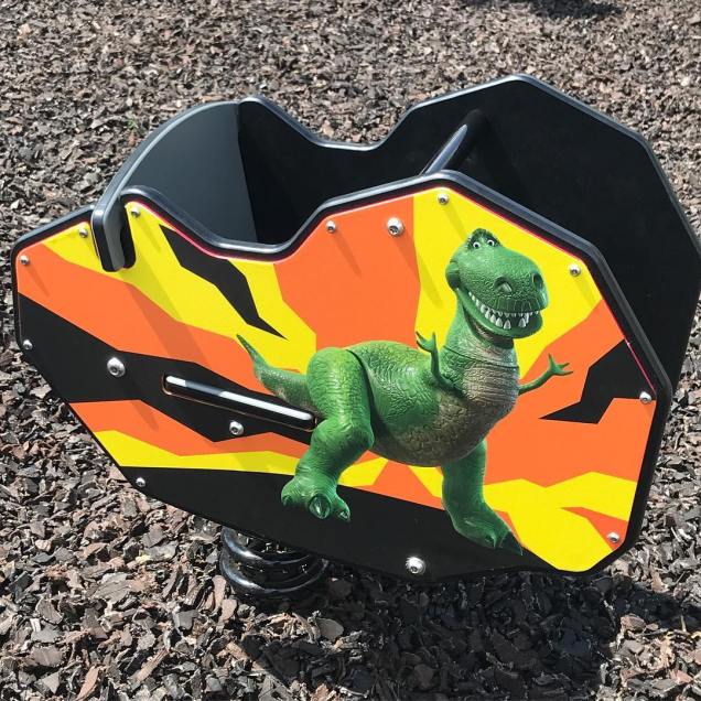 In the play area, there are little bouncy rides themed to Billy, Goat, and Gruff, decked out in stickers; Buzz’s spaceship, and Rex (Buttercup is on the other side)…