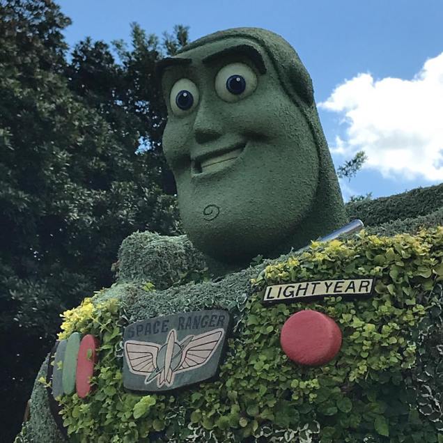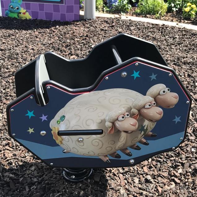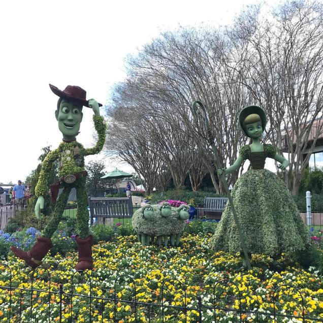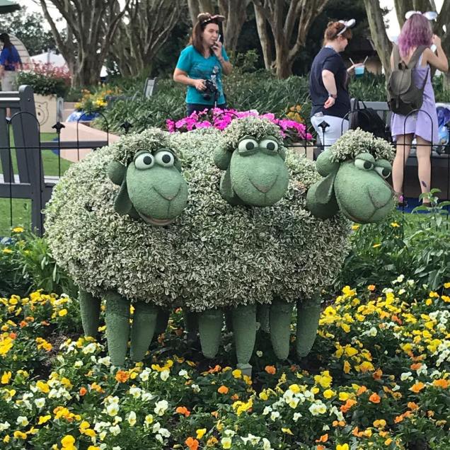 This playground – which was installed as part of the park’s Flower and Garden Festival – also features Toy Story topiaries. On one side of the path there’s a grouping of Woody and Bo Peep with her sheep, Billy, Goat, and Gruff; and on the other side is the Buzz topiary.