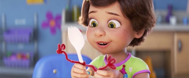 At school, Bonnie is having a hard time fitting in. She keeps quietly to herself, and some of the other kids aren’t nice to her – one bully in particular steals her craft supplies. Woody tries to help by gathering what bits he can from the trash and placing them where Bonnie can find them – and she in turn creates Forky. In the backpack with the new handmade toy, Woody is congratulating himself on saving the day at school: “We’ve got this whole school thing down. Wait, I can’t believe I’m talking to a spork.” Suddenly Forky comes to life, much to Woody’s surprise.