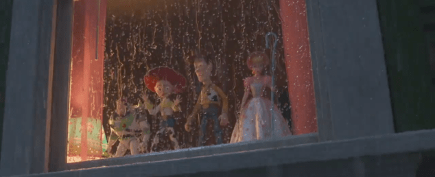 The movie opens nine years in the past, with the flashback scene we saw thanks to Good Morning America. The toys are working to rescue RC from being washed away in a rain storm, and picking up from the point where Jessie and the Barbies team up to open the window, Woody, Slink, and the barrel monkeys form a chain and manage to get RC to safety.